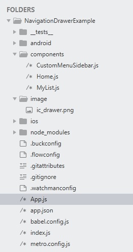 As we see in the folder structure I have created components folder in this I have created CustomMenuSidebar.js, Home.js, MyList.js let’s start with CustomMenuSidebar.js